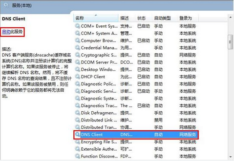 6、需要找到“DNS Client”项,并直接点击左上角的“启动此服务”,重启电脑就行了。如下图: