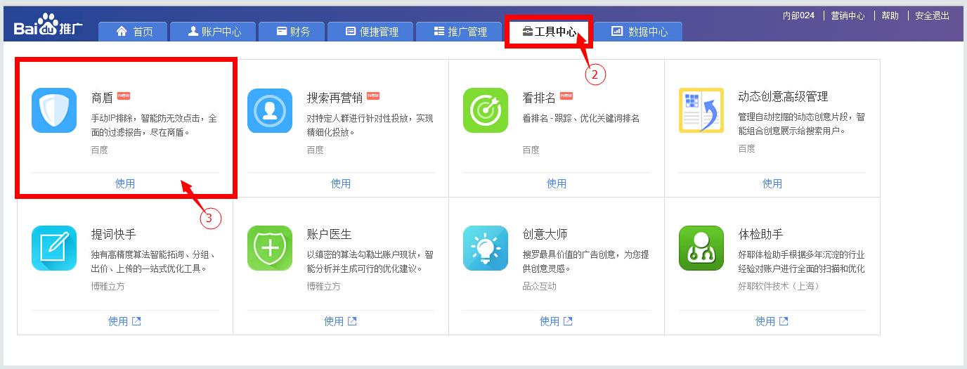 登录推广平台->点击搜索推广->点击工具中心->打开商盾