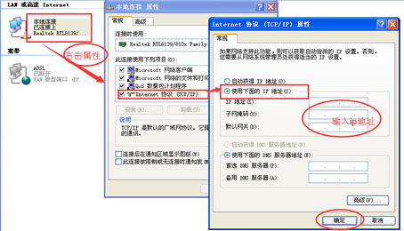 在“控制面板→网络连接→本地连接→右键属性→Internet协议(TCP/IP)→属性→使用下面的IP地址”,