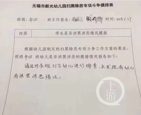上游新闻记者看到,这张《排查表》显示排查时间为5月27日,排查对象是无锡市新光幼儿园中四班的35名幼儿。《排查表》中对排查原因描述为:根据幼儿园制定的扫黑除恶专项斗争工作方案要求,现将中四班幼儿是否涉黑涉恶的摸排情况报告如下。回复是:“通过对本班35名幼儿进行排查,未发现有幼儿有涉黑涉恶情况。”表格抬头,附有两名班主任老师的签名。
