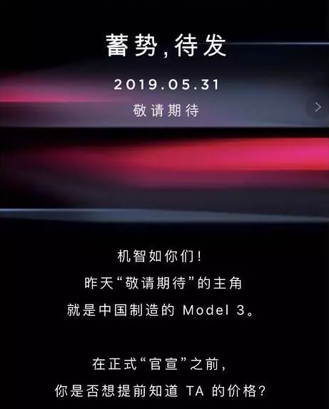 5月28日消息,特斯拉中国今日暗示将于5月31日公布Model 3的消息,消息称此次公布有可能与国产版Model 3的预订和价格有关。