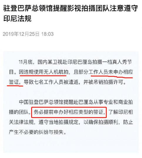 中国驻登巴萨总领馆消息,11月底,国内某卫视来巴厘岛拍摄一档真人秀节目。因违规使用无人机航拍,且部分工作人员未申办相应签证,导致七名工作人员被遣返,并被吊销拍摄许可。此事被印尼媒体报道,造成不良影响。