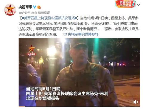 当地时间6月1日晚,四星上将、美军参谋长联席会议主席马克·米勒身穿迷彩服出现在华盛顿街头,他表示,人人都有权抗议