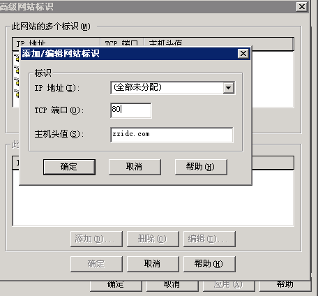 第三步,进入“高级网站标识”属性面板后,保持“ip地址”、“TCP端口”、“主机头值”下原有的默认值不变,点击选择“添加”按钮,出现“添加\编辑网站标识”的对话框,保持“IP地址”默认值不变,将“TCP端口”设置成“80”,“主机头值”是你要绑定的域名,可输入你要绑定的网址,设置完成后点击“确定”按钮保存即可,如下图: