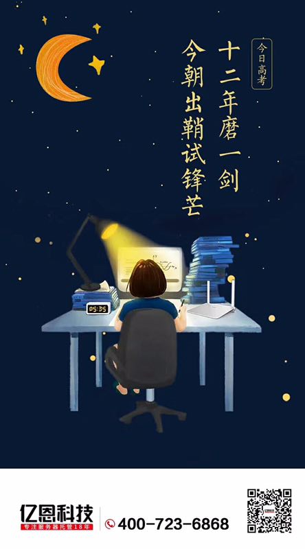 今天是6.7号,又到了一年一度的高考时间。高考是无数学子寒窗苦读十二年奋斗的目标,是无数贫困学生改变命运的一搏,也是为自己这么多的年的努力交一份答卷。高考之后,你将告别自己的青葱岁月,踏入人生的另一条道路,这条道路是坎坷还是平坦大道,决定权就在此一役。亿恩科技的小编在此为大家助力,希望大家都考到好的成绩,踏入自己理想的校园。