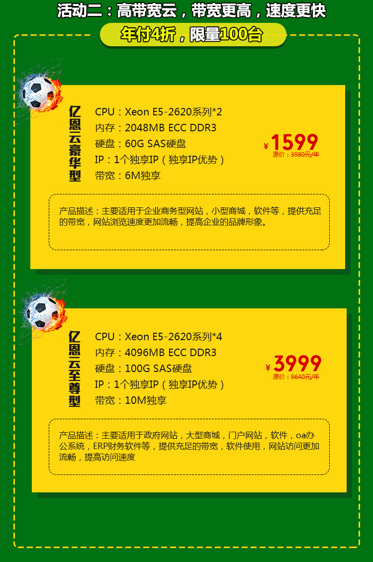 活动二:高带宽云,带宽更高,速度更快,年付4折,限量100台