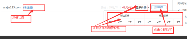 4、如果查询结果显示“未注册”,就说明该域名可以注册。点击【立即购买】
