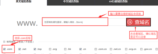 3、本文以注册英文.com域名为例。首先需要查询域名是否能注册,将自己的域名输入,选择.com后缀,点击“查域名”进行查询