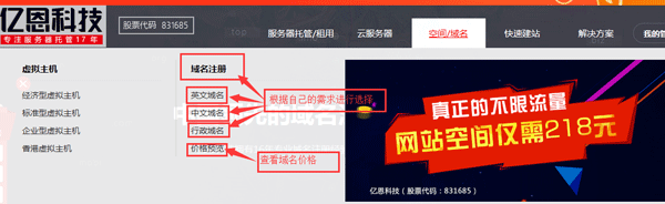 2、选择“空间/域名”,在下拉框中选择域名注册