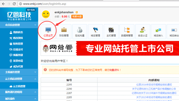 登录后会直接进入到我们用户系统,再点击“亿恩主页”选择相应的产品(云主机、虚拟主机、域名注册、快速建站等)。