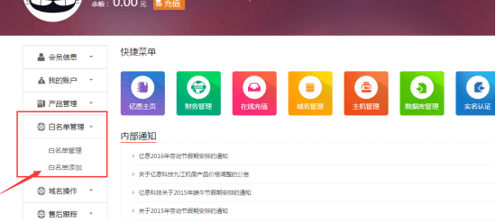 2、登录后在会员号下有一个白名单的添加,点击白名单管理下的白名单添加,如下图所示: