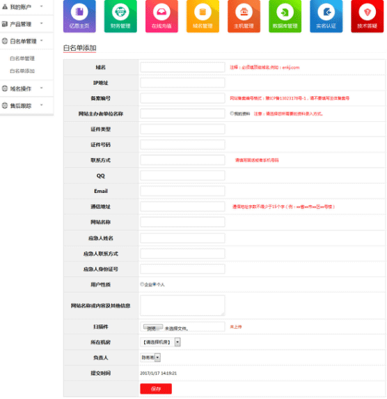 3、进入白名单添加页面,需要将下图中的信息填写完整,然后点击保存即可。