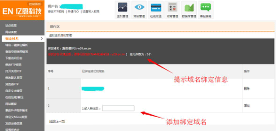 第二步就需要您在服务器中绑定您的域名到您的空间,请您在下方的方框中填写您的域名,然后点击增加。上方说明的有您能绑定的域名的上线,不同产品的上线不同。如果您想绑定更多域名需要升级空间。