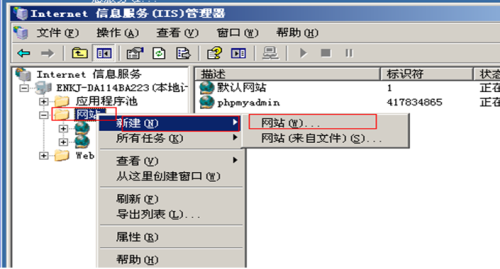 2、右键点击网站图标—>根据提示选择新建—>网站