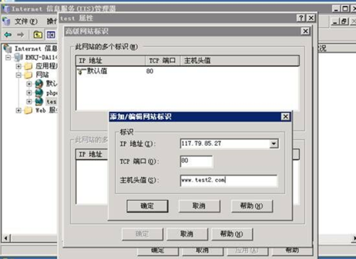 2)设置网站标识,可以为您的网站增加多个域名绑定,如图,选择“高级”选项,点击添加:输入IP,输入要绑定的域名,点击确定: