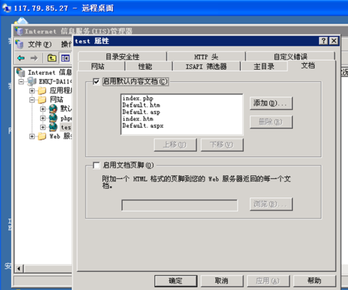 5)网站文档设置:把网站默认首页文档添加上,并上移至最顶端,点击确定,完成:
