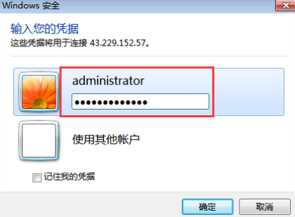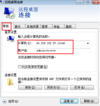2. 输入计算机IP和端口,用户名。注意:IP和端口之间的冒号是必须要在英文状态下输入的,否则就登录不上云服务器。用户名一般用默认的管理员的身份:administrator ,如果需要创建新的用户名,进入服务器后可以直接添加。建议大家在开通云服务器之后,要及时修改登录密码。
