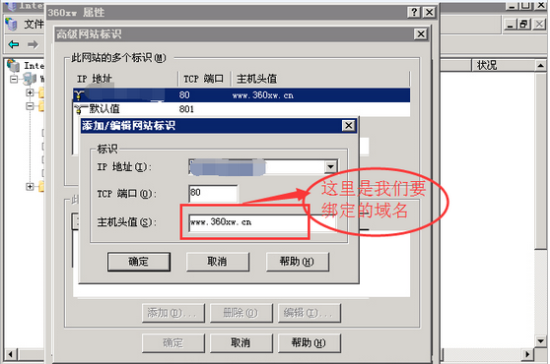 第三步,进入“高级网站标识”属性面板后,点击选择“添加”按钮,出现“添加\编辑网站标识”的对话框,保持“IP地址”默认值不变,将“TCP端口”设置成“80”,“主机头值”是你要绑定的域名,设置完成后点击“确定”按钮保存即可。